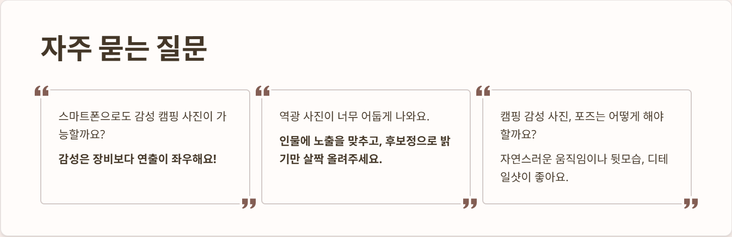 지금 이 순간, 여러분이 찍은 캠핑 사진 한 장이 언젠가 누군가에게는 평생 간직하고 싶은 추억이 될지도 몰라요. 감성은 장비나 기술보다 ‘느낌’에서 시작됩니다. 오늘 소개한 팁들, 하나씩 실천해보면서 나만의 캠핑 감성샷을 남겨보세요. 혹시 여러분만의 꿀팁이나 특별한 촬영 루틴이 있다면 댓글로 공유해 주세요! 저도 배워보고 싶네요. 다음에도 이렇게 소소하지만 확실한 팁들로 찾아올게요. 우리 또 만나요 😊