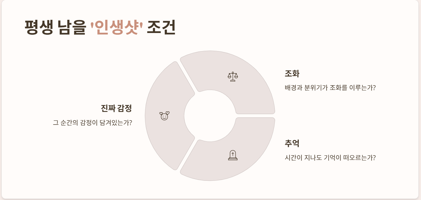진짜 인생샷은 단순히 예쁜 사진이 아니에요. 그 안에 감정과 이야기가 담겨 있어야 하죠. 그래서 저는 다음 세 가지 조건이 모두 갖춰졌을 때 비로소 ‘인생샷’이라고 생각해요.